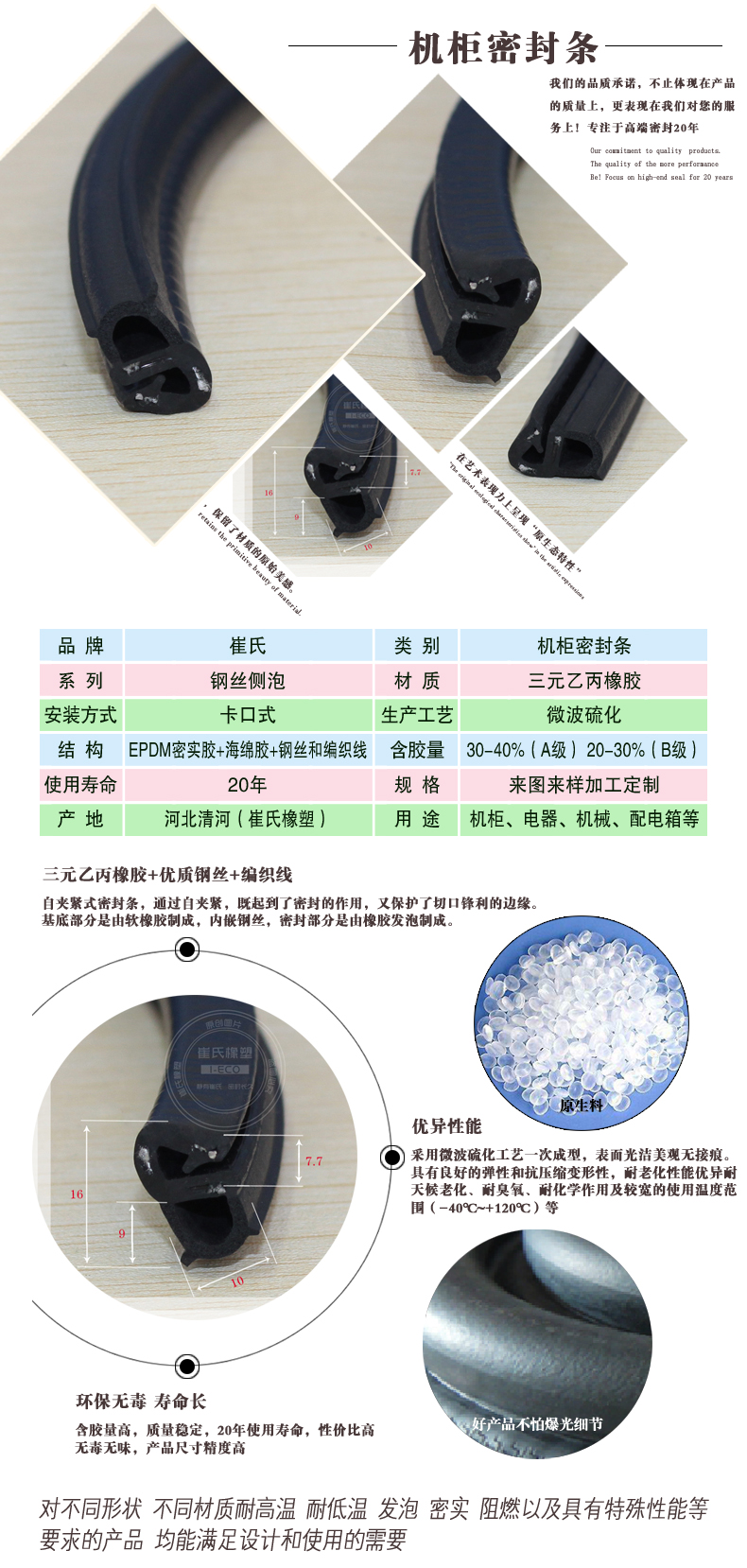 此機柜密封條是由具有良好彈性和抗壓縮變形、耐老化、臭氧、化學作用、較寬的使用溫度范圍(-40℃~+120℃)的三元乙丙橡膠(EPDM)橡膠發(fā)泡與密實復合而成,內(nèi)含獨特的金屬夾具和舌形扣,堅固耐用。在各種機柜上起著很關鍵的作用。