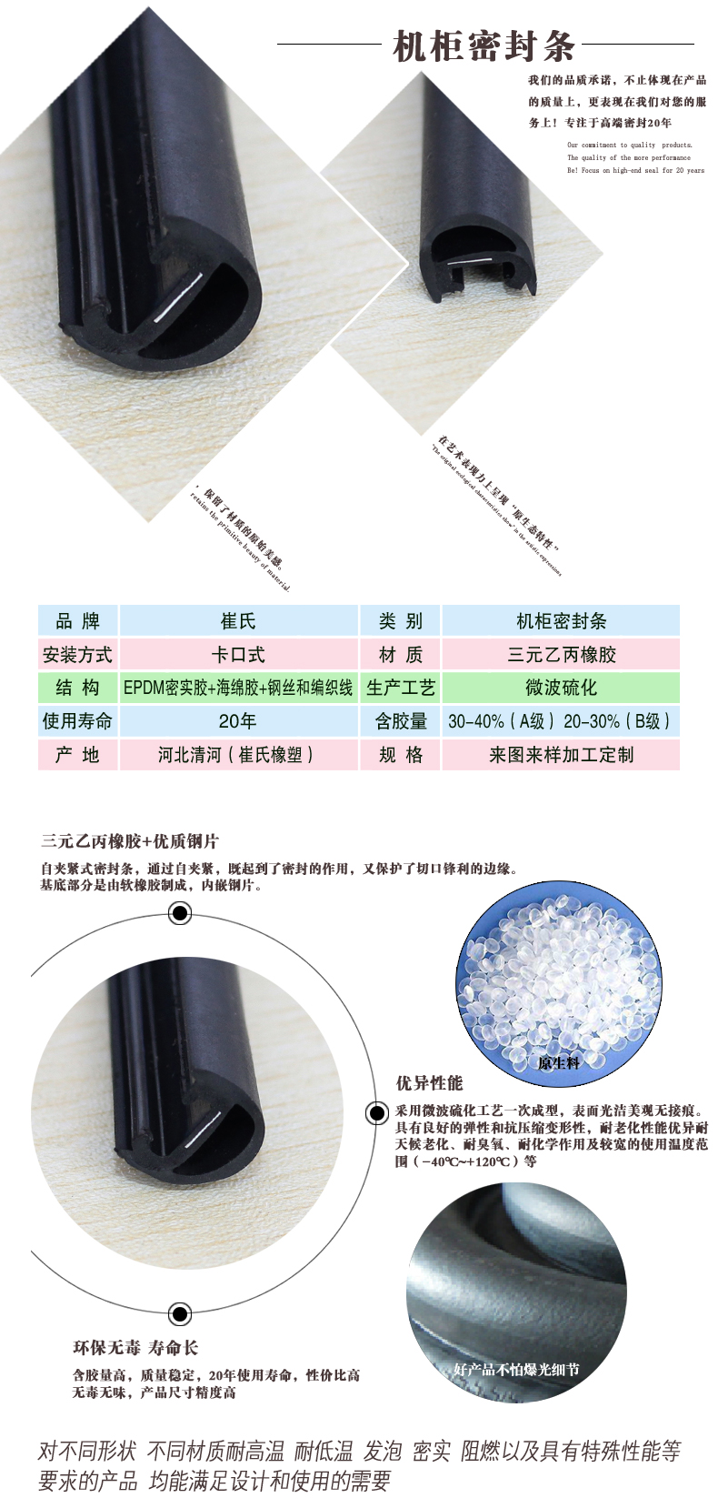 根據(jù)機柜的使用情況,研發(fā)出具有自身特點的機柜防水膠條其具有密封性好,防水,防火、防蟲、防風、隔光、防撞以及機柜防水膠條使用年限長等特點。此機柜密封條是由具有良好彈性和抗壓縮變形、耐老化、臭氧、化學作用、較寬的使用溫度范圍(-40℃~+120℃)的三元乙丙橡膠(EPDM)橡膠發(fā)泡與密實復合而成,內(nèi)含獨特的金屬夾具和舌形扣,堅固耐用。在各種機柜上起著很關(guān)鍵的作用。