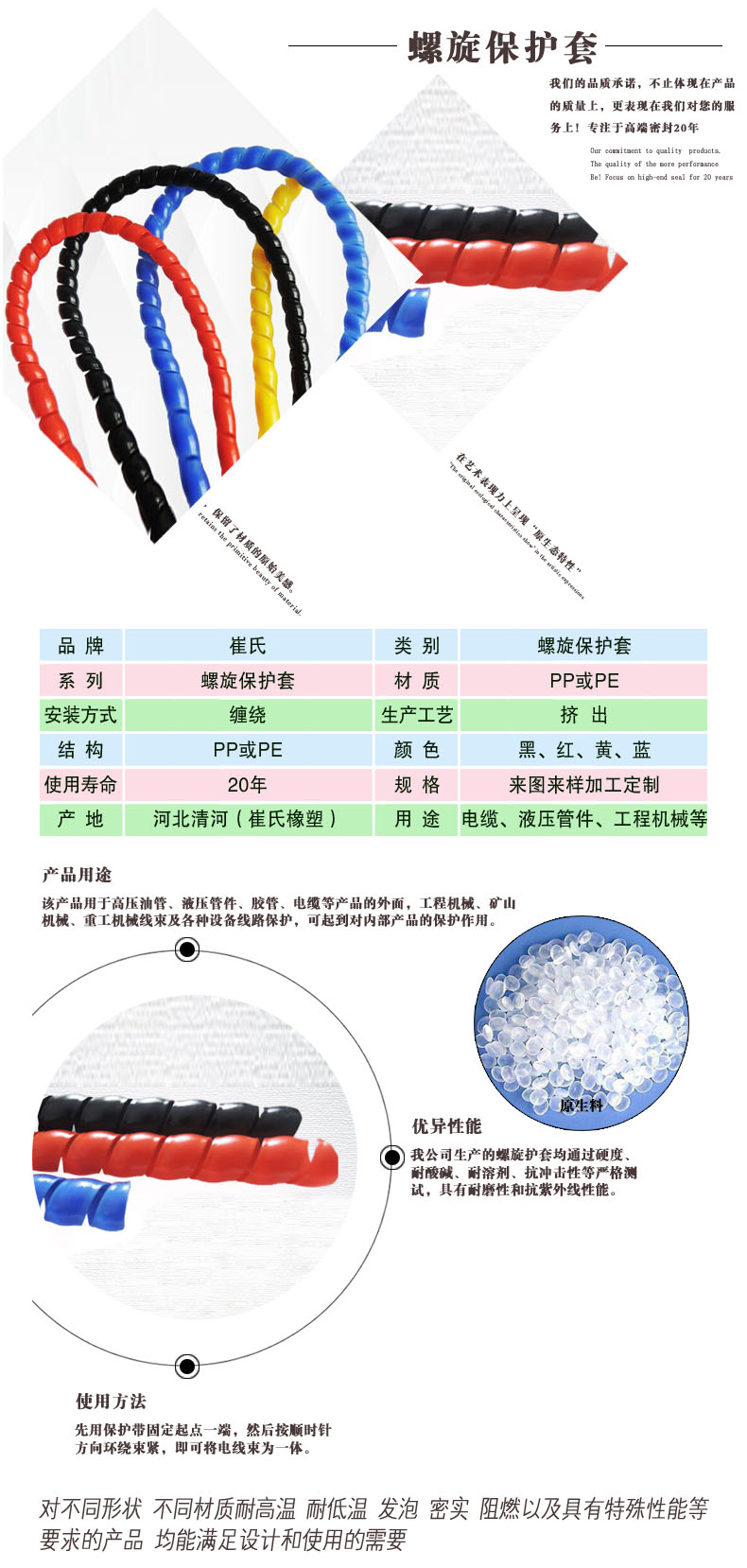 螺旋保護(hù)套為螺旋狀,具有很好的彈力、拉伸力,可以對液壓膠管、電線、電纜等內(nèi)部產(chǎn)品起到很好的束縛作用。目前國內(nèi)采用的原材料為聚丙烯(PP)、聚乙烯(PE)或尼龍(PA),使產(chǎn)品具有很好的耐磨作用。此外,螺旋保護(hù)套還具有良好的耐高低溫、耐油、抗紫外線、抗靜電、抗沖擊、抗拉伸等性能。