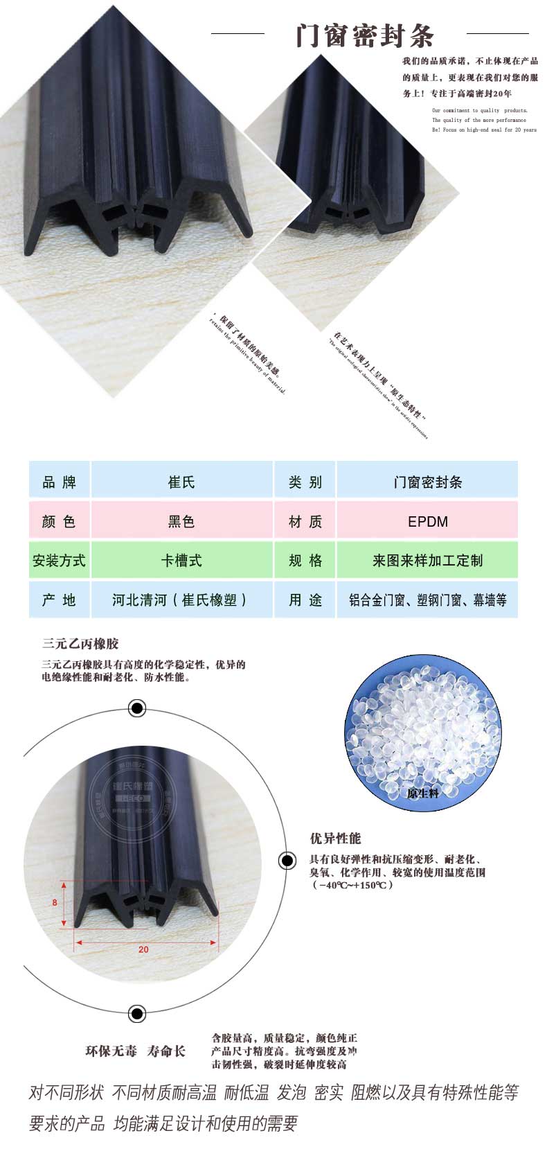 河北崔氏橡塑制品科技有限公司,具有經(jīng)驗(yàn)豐富的技術(shù)人員,專業(yè)的研發(fā)團(tuán)隊(duì),優(yōu)質(zhì)的服務(wù),大批量供應(yīng),產(chǎn)品通過國際質(zhì)量認(rèn)證,價(jià)格合理,供貨迅速。我公司將根據(jù)客戶的來樣或圖紙進(jìn)行開發(fā)訂做,也可根據(jù)型材口型進(jìn)行研發(fā)。我公司將全程為廣大客戶解決產(chǎn)品的技術(shù)問題,并鄭重承諾如出現(xiàn)任何質(zhì)量問題將無條件退貨。