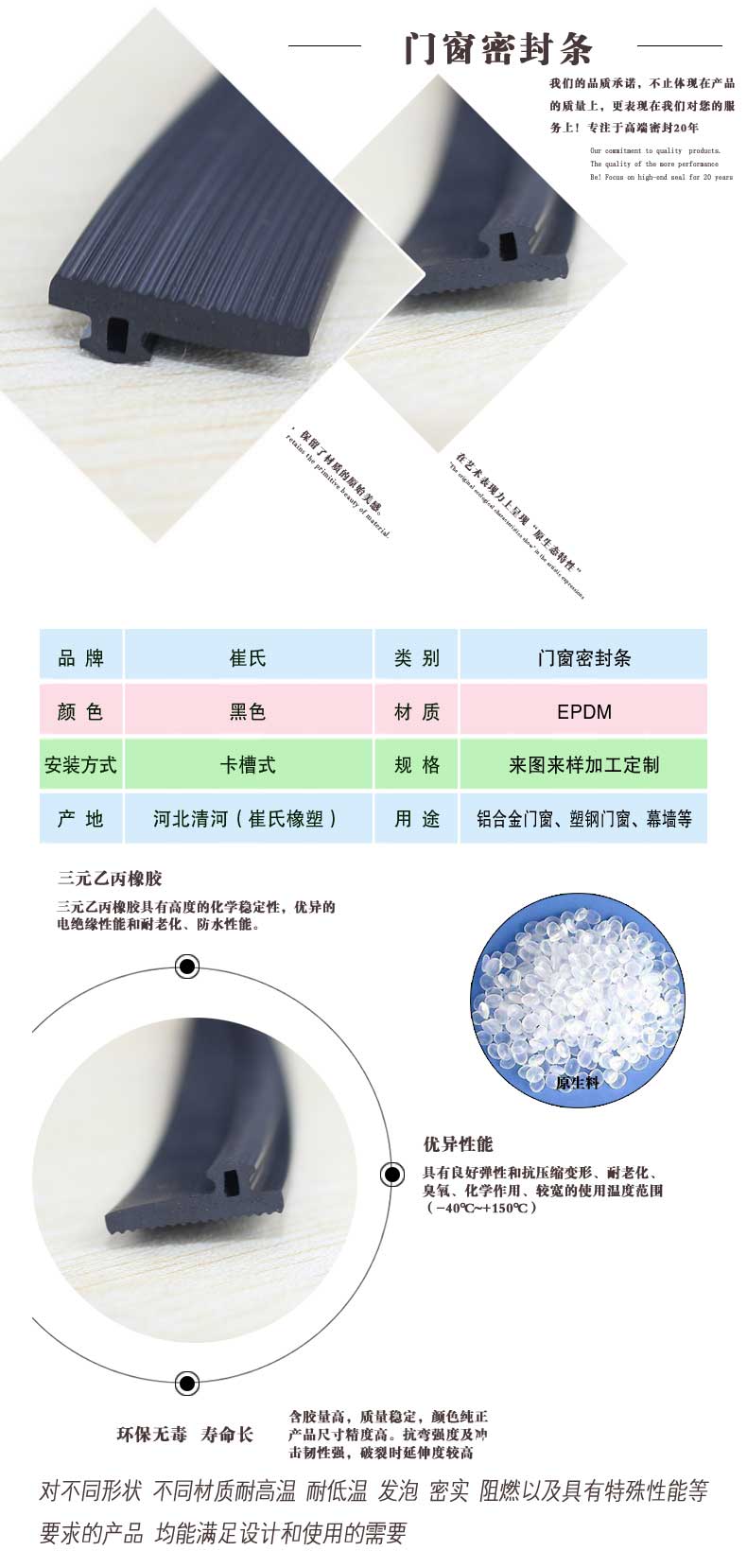 河北崔氏橡塑制品科技有限公司,具有經(jīng)驗(yàn)豐富的技術(shù)人員,專(zhuān)業(yè)的研發(fā)團(tuán)隊(duì),優(yōu)質(zhì)的服務(wù),大批量供應(yīng),產(chǎn)品通過(guò)國(guó)際質(zhì)量認(rèn)證,價(jià)格合理,供貨迅速。我公司將根據(jù)客戶的來(lái)樣或圖紙進(jìn)行開(kāi)發(fā)訂做,也可根據(jù)型材口型進(jìn)行研發(fā)。我公司將全程為廣大客戶解決產(chǎn)品的技術(shù)問(wèn)題,并鄭重承諾如出現(xiàn)任何質(zhì)量問(wèn)題將無(wú)條件退貨。