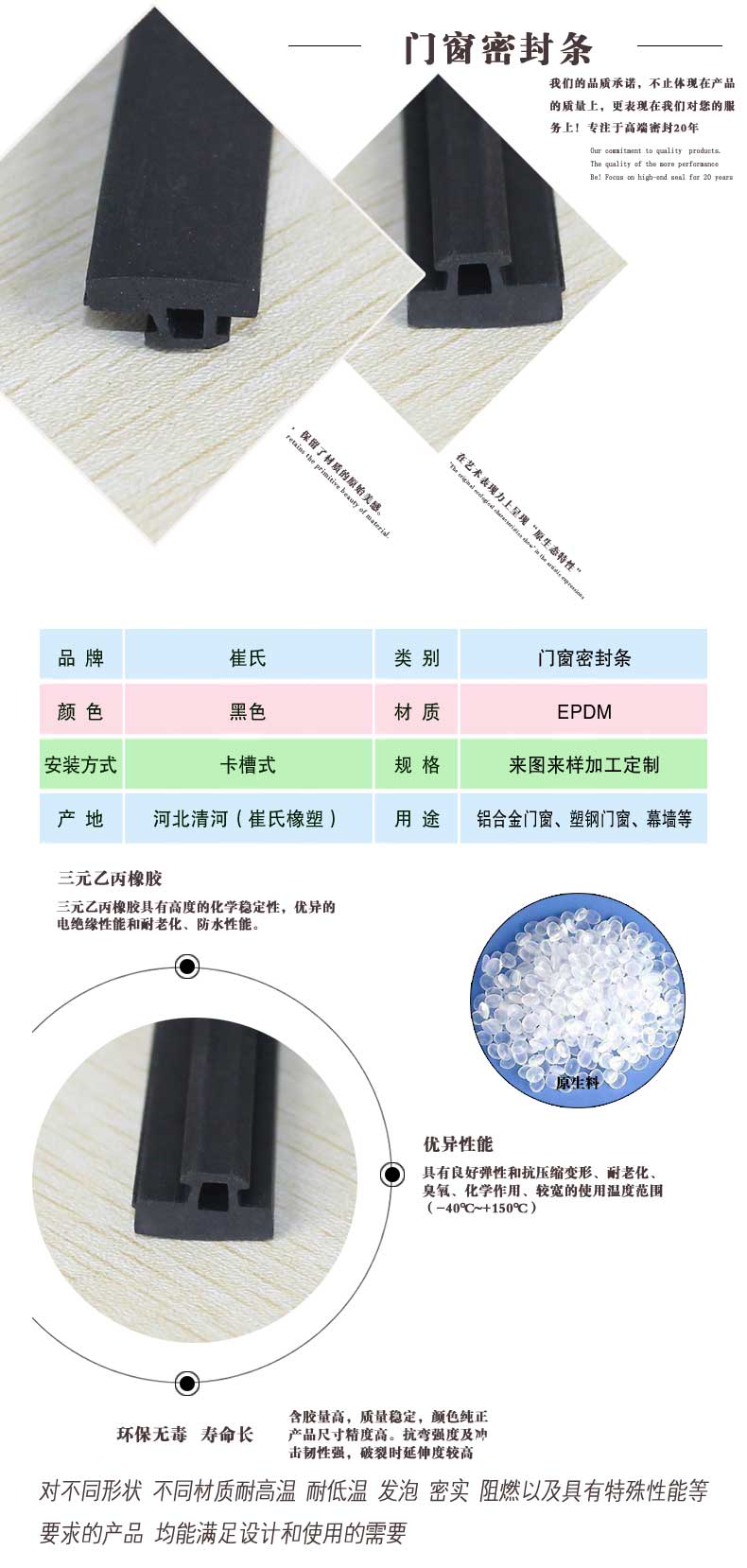 河北崔氏橡塑制品科技有限公司,具有經(jīng)驗(yàn)豐富的技術(shù)人員,專業(yè)的研發(fā)團(tuán)隊(duì),優(yōu)質(zhì)的服務(wù),大批量供應(yīng),產(chǎn)品通過國(guó)際質(zhì)量認(rèn)證,價(jià)格合理,供貨迅速。我公司將根據(jù)客戶的來樣或圖紙進(jìn)行開發(fā)訂做,也可根據(jù)型材口型進(jìn)行研發(fā)。我公司將全程為廣大客戶解決產(chǎn)品的技術(shù)問題,并鄭重承諾如出現(xiàn)任何質(zhì)量問題將無條件退貨。