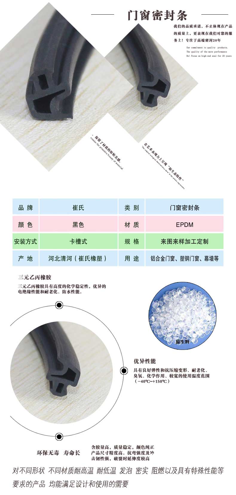 河北崔氏橡塑制品科技有限公司,具有經驗豐富的技術人員,專業(yè)的研發(fā)團隊,優(yōu)質的服務,大批量供應,產品通過國際質量認證,價格合理,供貨迅速。我公司將根據(jù)客戶的來樣或圖紙進行開發(fā)訂做,也可根據(jù)型材口型進行研發(fā)。我公司將全程為廣大客戶解決產品的技術問題,并鄭重承諾如出現(xiàn)任何質量問題將無條件退貨。