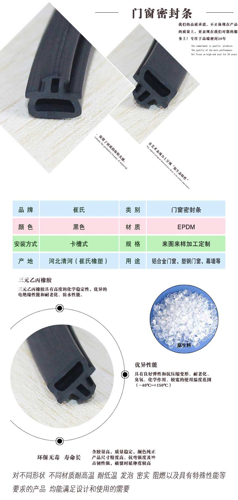 三元乙丙密封條,彈性好,密封性好,具有很好的耐腐蝕性,耐老化性(產(chǎn)品放于陽光下暴曬三年而不出現(xiàn)裂痕) 三元乙丙密封條有優(yōu)異的耐天候、耐臭氧、耐熱、耐酸堿、耐水蒸汽、顏色穩(wěn)定性、電性能、充油性及常溫流動性。三元乙丙橡膠制品在120℃下可長期使用,在150-200℃下可短暫或間歇使用。加入適宜防老劑可提高其使用溫度。以過氧化物交聯(lián)的三元乙丙橡膠可在苛刻的條件下使用。三元乙丙橡膠密封條在臭氧濃度50pphm、拉伸30%的條件下,可達150h以上不龜裂。,耐候性(使用溫度范圍-40℃-150℃),耐化學(xué)性。加入阻燃劑后具有很好的防火阻燃性,產(chǎn)品采用微波連續(xù)硫化工藝一次性加工成型,表面光滑美觀,性能更加穩(wěn)定不易變型。