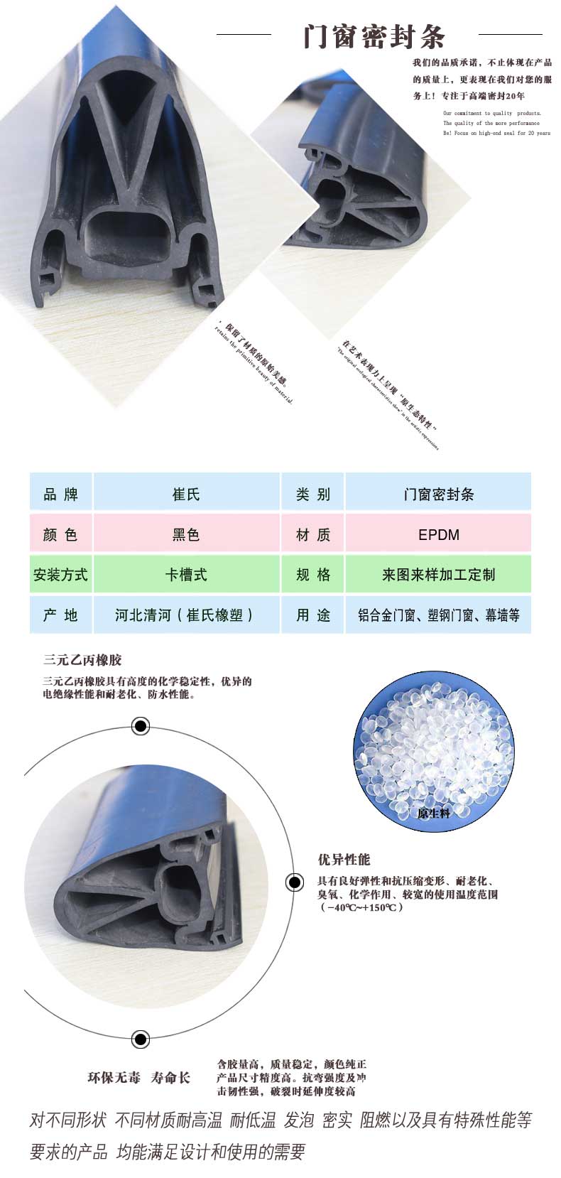 三元乙丙密封條,彈性好,密封性好,具有很好的耐腐蝕性,耐老化性(產(chǎn)品放于陽光下暴曬三年而不出現(xiàn)裂痕) 三元乙丙密封條有優(yōu)異的耐天候、耐臭氧、耐熱、耐酸堿、耐水蒸汽、顏色穩(wěn)定性、電性能、充油性及常溫流動性。三元乙丙橡膠制品在120℃下可長期使用,在150-200℃下可短暫或間歇使用。加入適宜防老劑可提高其使用溫度。以過氧化物交聯(lián)的三元乙丙橡膠可在苛刻的條件下使用。三元乙丙橡膠密封條在臭氧濃度50pphm、拉伸30%的條件下,可達150h以上不龜裂。,耐候性(使用溫度范圍-40℃-150℃),耐化學性。加入阻燃劑后具有很好的防火阻燃性,產(chǎn)品采用微波連續(xù)硫化工藝一次性加工成型,表面光滑美觀,性能更加穩(wěn)定不易變型。