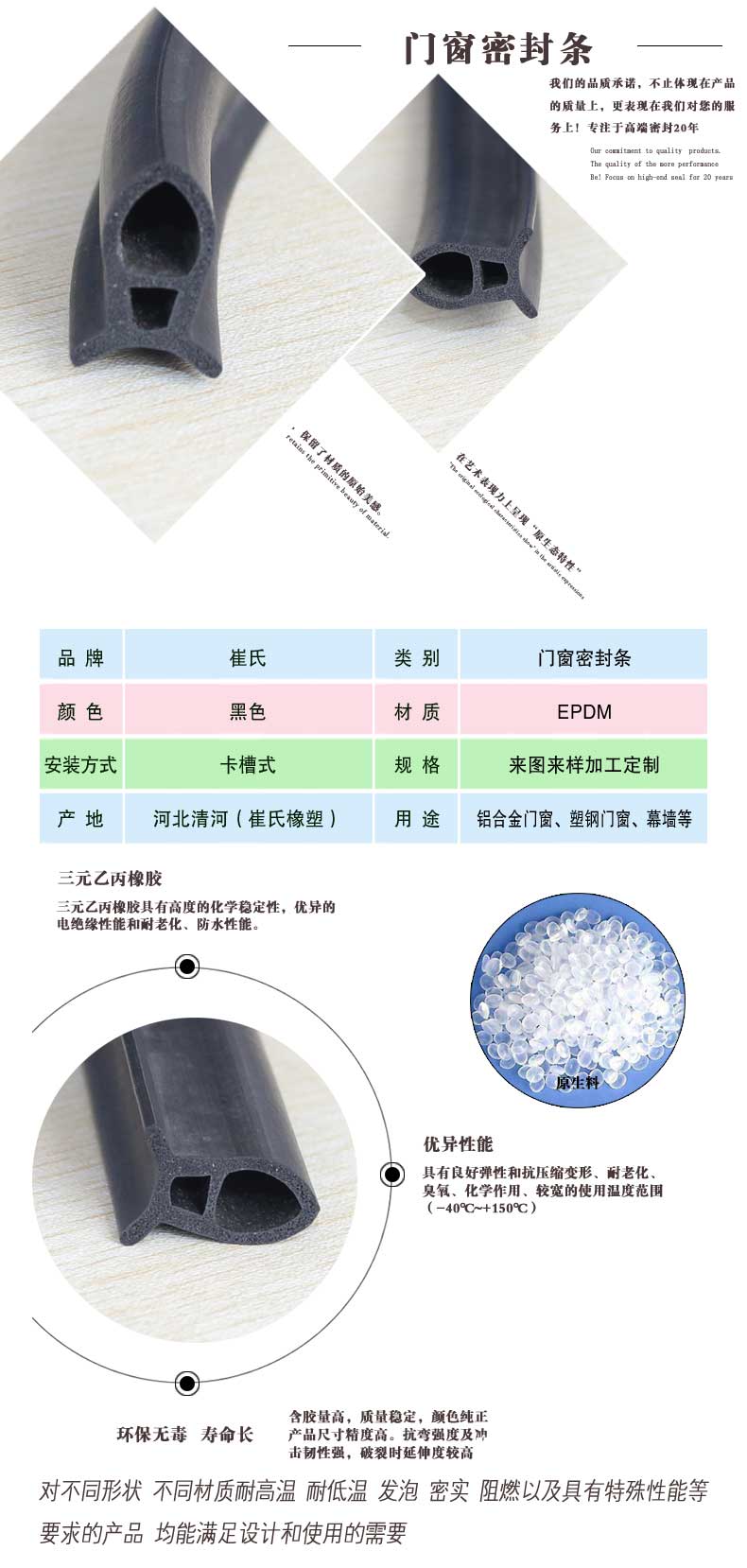 采用EPDM作原料,表面光滑細(xì)致,回彈性好,好泡均勻,防水性能一流,抗臭氧,耐老化,耐溶劑性能均佳。
