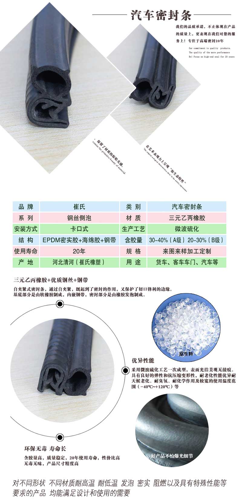崔氏車門密封條,橡膠密封品牌中優(yōu)質的選擇,是車輛制造廠優(yōu)質的選擇,采用微波硫化一次成型,獨特的配方設計使三元乙丙橡膠密封條具有優(yōu)越的抗老化、耐高低溫及耐化學藥品性能,具有良好的彈性和抗壓縮變形性,長期使用不會龜裂或變形,在-40度至150度之間都能維持其原有的高密封性能。