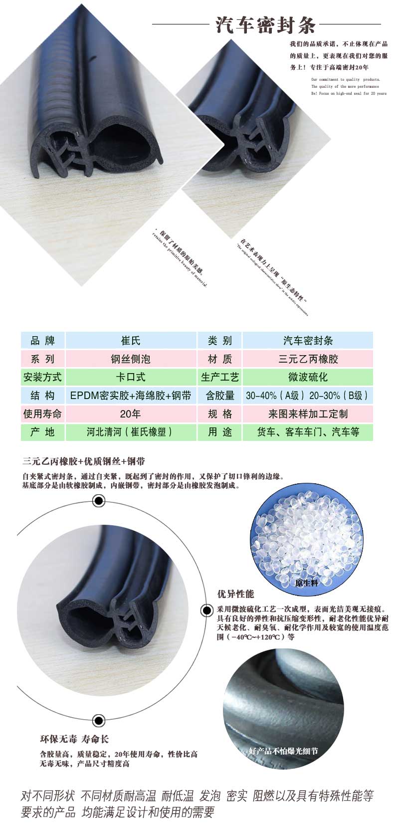 崔氏車門密封條,橡膠密封品牌中優(yōu)質(zhì)的選擇,是車輛制造廠優(yōu)質(zhì)的選擇,采用微波硫化一次成型,獨(dú)特的配方設(shè)計(jì)使三元乙丙橡膠密封條具有優(yōu)越的抗老化、耐高低溫及耐化學(xué)藥品性能,具有良好的彈性和抗壓縮變形性,長(zhǎng)期使用不會(huì)龜裂或變形,在-40度至150度之間都能維持其原有的高密封性能。