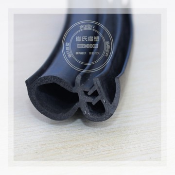 產(chǎn)品結(jié)構(gòu):門 框密封條不但要保證密封性,還要承受關(guān)門時(shí)的沖擊力,因此它既要有彈性,也要有韌性,主要由密實(shí)膠基體和海綿膠泡管兩部分組成。密實(shí)膠內(nèi)含有金屬骨架,起 到加強(qiáng)膠條的定型和固定作用。海綿膠泡管柔軟并富有彈性,起著受壓變形,卸壓反彈的功能。此外,有一些密封條的唇邊部分由彩色膠構(gòu)成或者貼有織物,色調(diào)美 觀有裝飾作用。