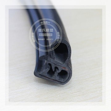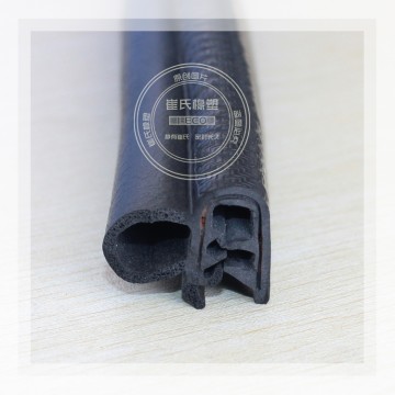 產(chǎn)品結(jié)構(gòu):門 框密封條不但要保證密封性,還要承受關(guān)門時(shí)的沖擊力,因此它既要有彈性,也要有韌性,主要由密實(shí)膠基體和海綿膠泡管兩部分組成。密實(shí)膠內(nèi)含有金屬骨架,起 到加強(qiáng)膠條的定型和固定作用。海綿膠泡管柔軟并富有彈性,起著受壓變形,卸壓反彈的功能。此外,有一些密封條的唇邊部分由彩色膠構(gòu)成或者貼有織物,色調(diào)美 觀有裝飾作用。