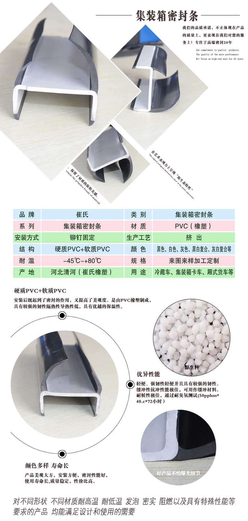 崔氏集裝箱密封條使用環(huán)境溫度為-45℃~+80℃,通常采用PVC材質進行生產(chǎn),正常條件下,使用壽命不少于5年