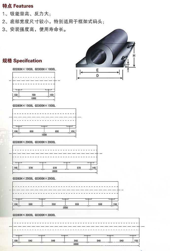 GD型護(hù)舷除小型碼頭設(shè)計(jì)采用,在碼頭上部前沿作為碼頭二級(jí)防護(hù)(與其它護(hù)舷一并布置)也多被采用,一般為連續(xù)布置,當(dāng)船舶非正常靠泊時(shí),避免船舶直接撞擊碼頭。