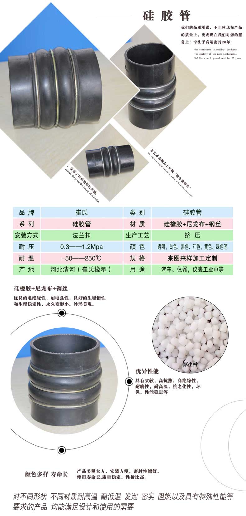 采用專業(yè)的耐高低溫硅膠原材料制成,主要用于高溫高壓等特殊環(huán)境作業(yè),類似的特殊環(huán)境用途硅膠管還有編織(增強(qiáng))硅膠管、硅膠復(fù)合管等產(chǎn)品