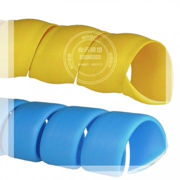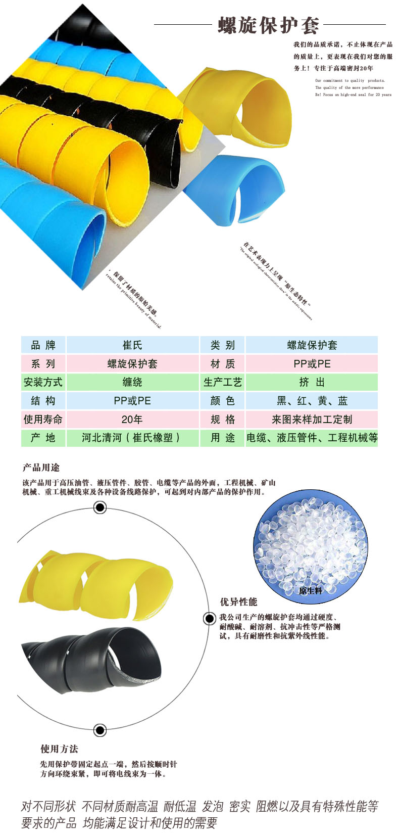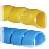 螺旋保護套為螺旋狀,具有很好的彈力、拉伸力,可以對液壓膠管、電線、電纜等內部產品起到很好的束縛作用。目前國內采用的原材料為聚丙烯(PP)、聚乙烯(PE)或尼龍(PA),使產品具有很好的耐磨作用。此外,螺旋保護套還具有良好的耐高低溫、耐油、抗紫外線、抗靜電、抗沖擊、抗拉伸等性能。
