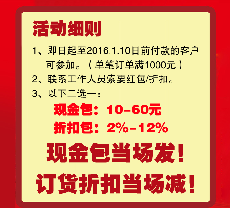 崔氏橡塑元旦大紅包,可遇不可求。2016.1.10日前下單訂貨(含PU包覆式密封條、三元乙丙密封條、硅膠橡膠密封條、海綿密封條、橡膠管)的客戶,訂單滿1000元即可參與活動??捎?0-60元現(xiàn)金紅包,或2-12%優(yōu)惠,大家抓緊聯(lián)系銷售人員400-0329-345。