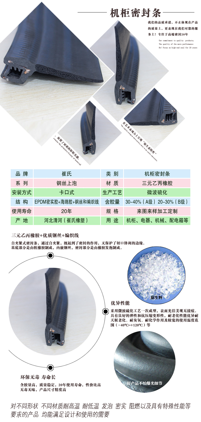 鋼絲機(jī)柜密封條密封性好,防水,防火、防蟲、防風(fēng)、隔光、防撞以及使用年限長(zhǎng),機(jī)柜防水膠條是由具有良好彈性和抗壓縮變形、耐老化、臭氧、化學(xué)作用、較寬的使用溫度范圍(-40℃~+120℃)的三元乙丙橡膠(EPDM)橡膠發(fā)泡與密實(shí)復(fù)合而成,內(nèi)含獨(dú)特的金屬夾具和舌形扣,堅(jiān)固耐用. 在各種電器上起著很關(guān)鍵的作用。機(jī)柜防水膠條的安裝與使用機(jī)柜防水膠條采用優(yōu)質(zhì)三元乙丙橡膠,發(fā)泡工藝制作??估匣?、耐高低溫、防水、防塵、隔音、隔溫、減震。-50度—70度之間都能維持其原有的高密封性能。機(jī)柜防水膠條背面采用進(jìn)口雙面膠帶,夾層為網(wǎng)格狀玻璃纖維。