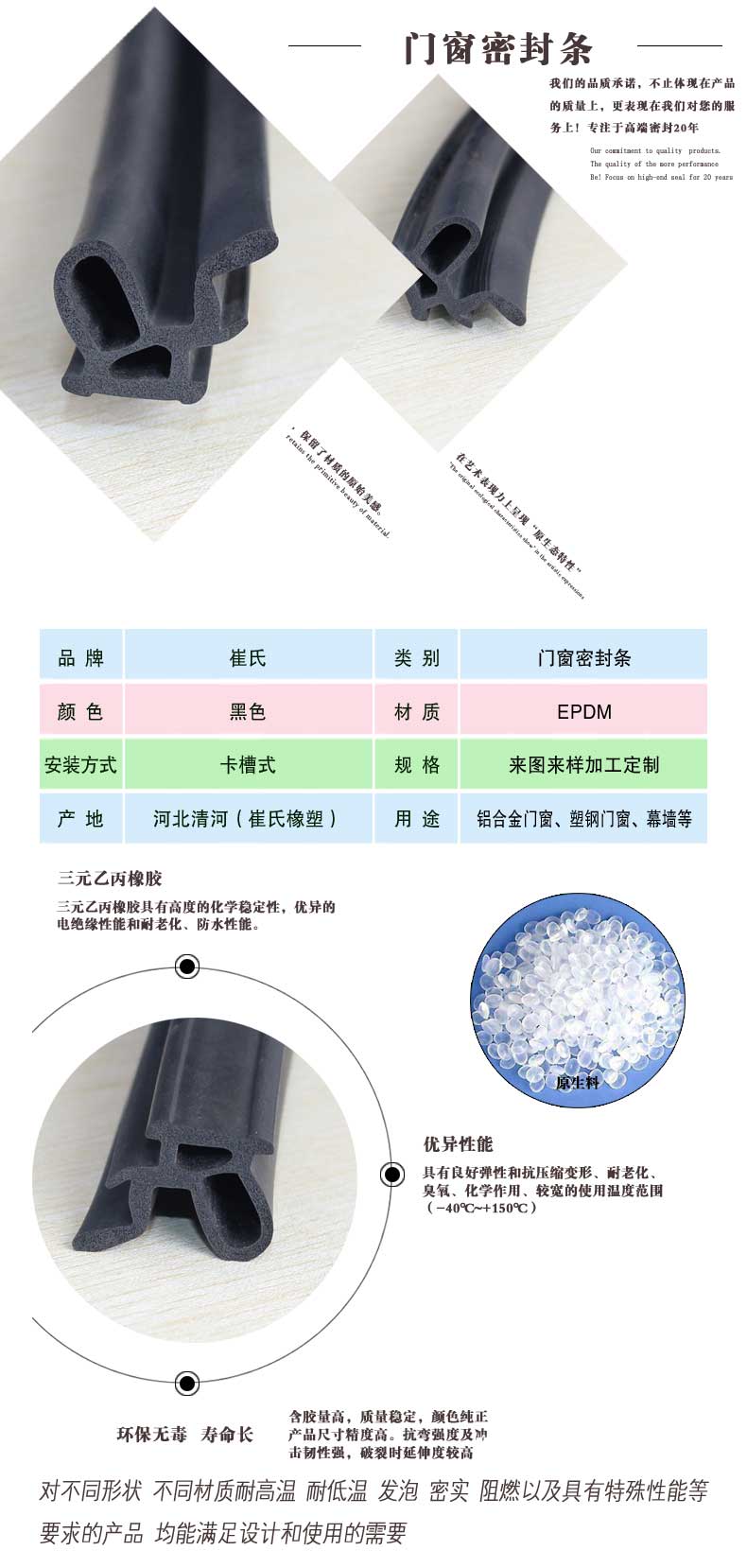 采用EPDM作原料,表面光滑細致,回彈性好,好泡均勻,防水性能一流,抗臭氧,耐老化,耐溶劑性能均佳。