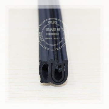 產(chǎn)品結(jié)構(gòu):門 框密封條不但要保證密封性,還要承受關(guān)門時(shí)的沖擊力,因此它既要有彈性,也要有韌性,主要由密實(shí)膠基體和海綿膠泡管兩部分組成。密實(shí)膠內(nèi)含有金屬骨架,起 到加強(qiáng)膠條的定型和固定作用。海綿膠泡管柔軟并富有彈性,起著受壓變形,卸壓反彈的功能。此外,有一些密封條的唇邊部分由彩色膠構(gòu)成或者貼有織物,色調(diào)美 觀有裝飾作用。