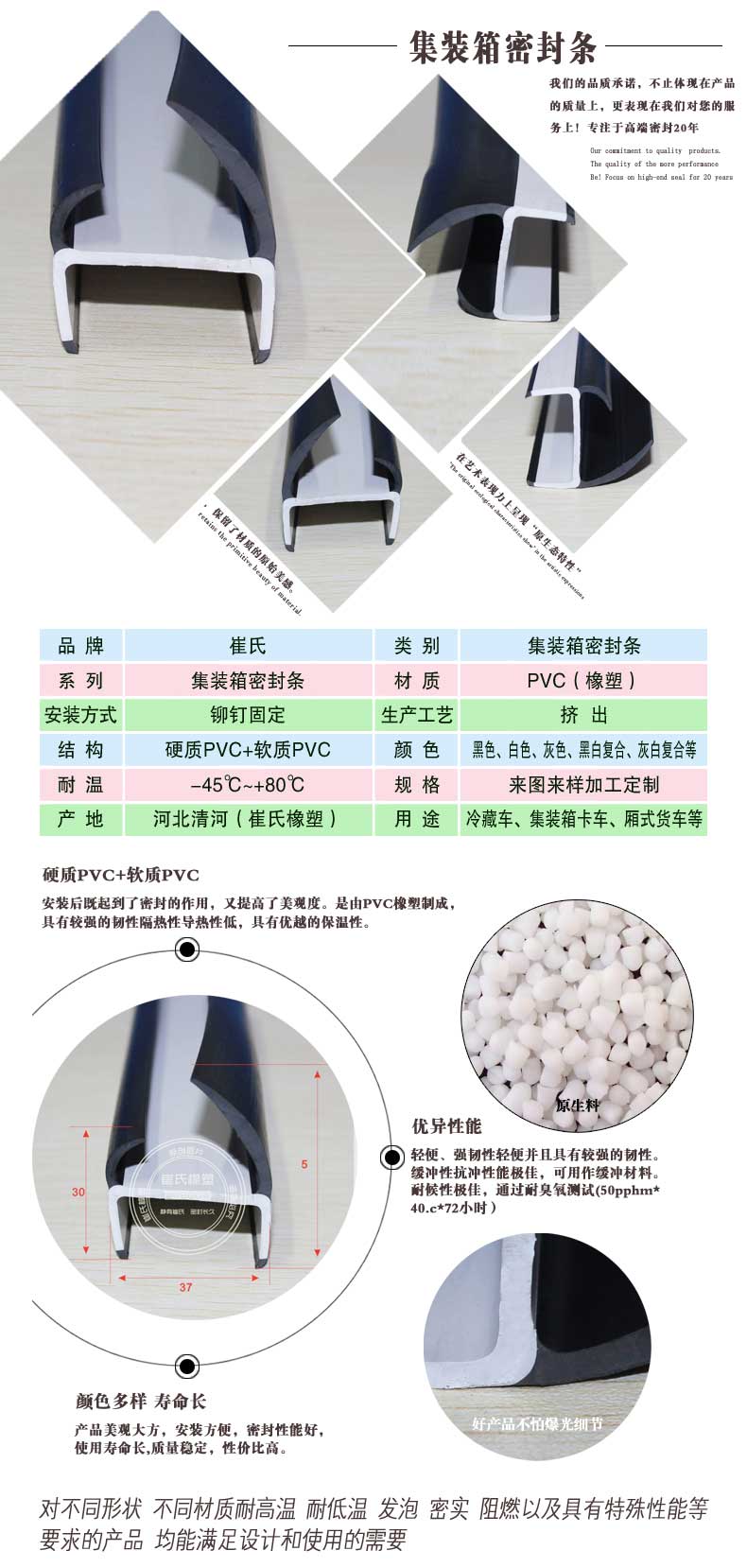 崔氏集裝箱密封條使用環(huán)境溫度為-45℃~+80℃,通常采用PVC材質(zhì)進(jìn)行生產(chǎn),正常條件下,使用壽命不少于5年