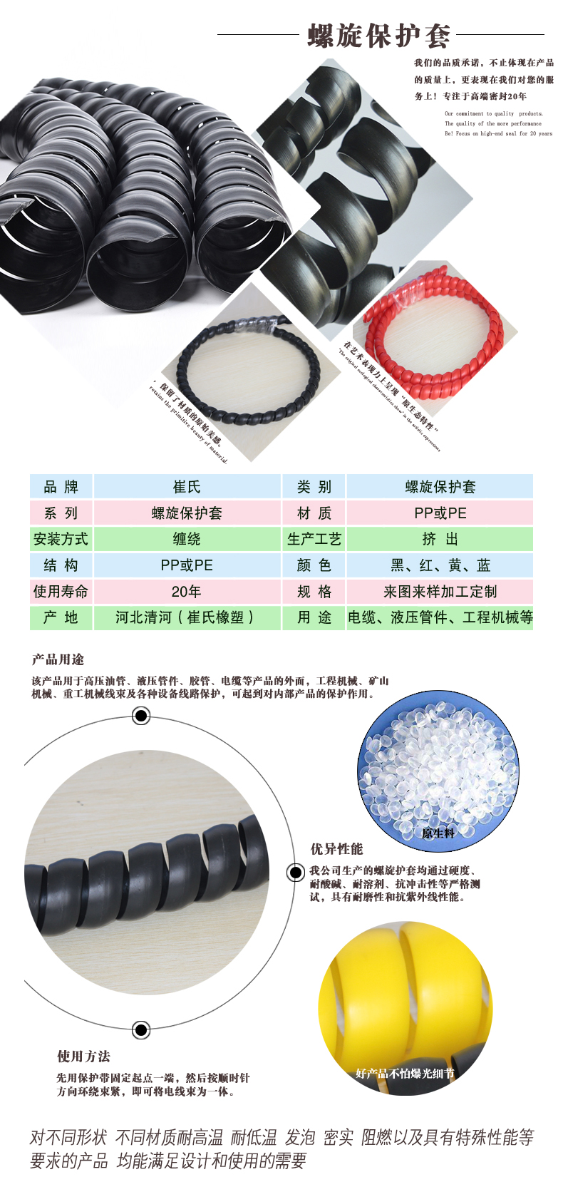 螺旋保護(hù)套為螺旋狀,具有很好的彈力、拉伸力,可以對(duì)液壓膠管、電線、電纜等內(nèi)部產(chǎn)品起到很好的束縛作用。目前國(guó)內(nèi)采用的原材料為聚丙烯(PP)、聚乙烯(PE)或尼龍(PA),使產(chǎn)品具有很好的耐磨作用。此外,螺旋保護(hù)套還具有良好的耐高低溫、耐油、抗紫外線、抗靜電、抗沖擊、抗拉伸等性能。