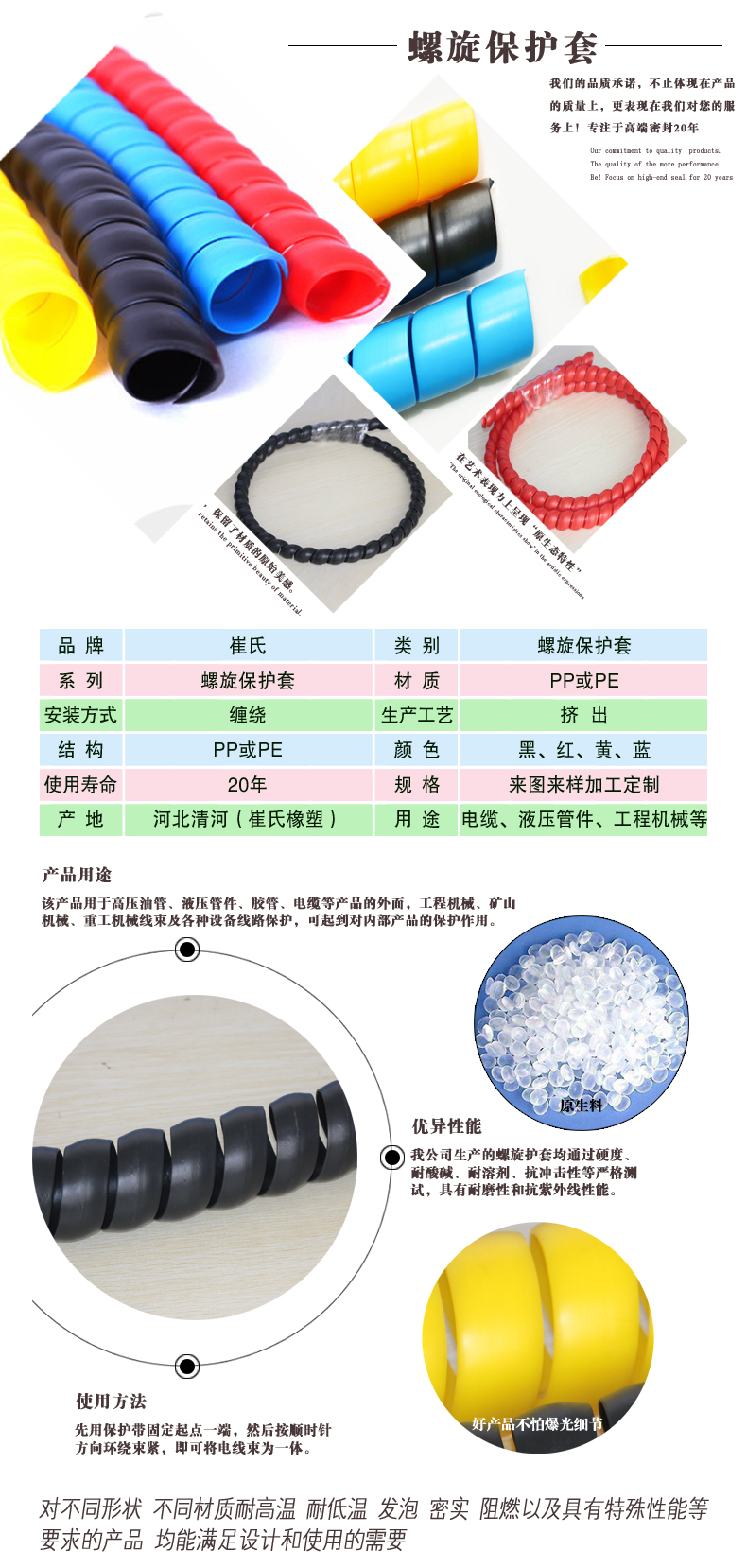 螺旋保護(hù)套為螺旋狀,具有很好的彈力、拉伸力,可以對液壓膠管、電線、電纜等內(nèi)部產(chǎn)品起到很好的束縛作用。目前國內(nèi)采用的原材料為聚丙烯(PP)、聚乙烯(PE)或尼龍(PA),使產(chǎn)品具有很好的耐磨作用。此外,螺旋保護(hù)套還具有良好的耐高低溫、耐油、抗紫外線、抗靜電、抗沖擊、抗拉伸等性能。
